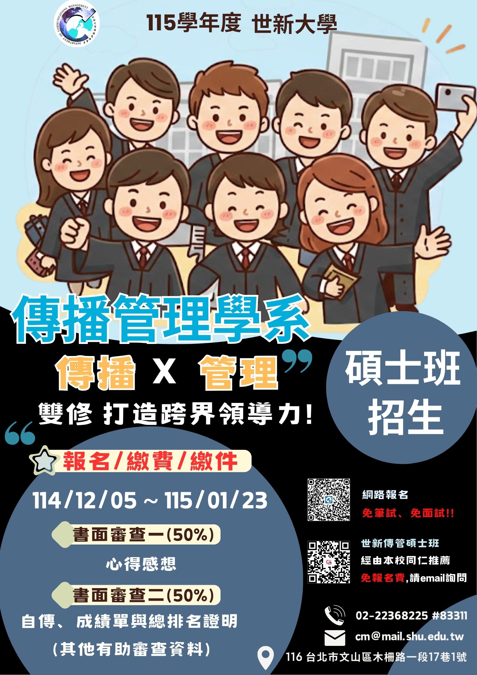🎓【世新傳管碩士班|115學年度一般生招生開跑!】 發佈日期: 2025-12-012026-01-02 作者: 傳播管理學系 你想學傳播?懂管理?玩創新?看懂數據? 來世新傳管,讓你成為未來的主角!🌟 💡 為什麼選世新傳管? ✨ 傳播 × 管理 × 創新 × 數據 ✨ 打造全方位跨域領導人才 ✨ 書審100% (免筆試、免面試)! ✨ 經本校教職員推薦免報名費! 📌 報名資訊 🗓 報名/繳費/繳件:114/12/05~115/01/23 📝 考試方式:書面審查(100%) 🎓 報考資格: 1.大學畢業(含應屆) 2.同等學力資格者 📂 備審資料: ✔觀察報告或心得感想 ✔ 自傳 ✔ 成績單與總排名證明 ✔ 其他有助審查資料 🔗 快速連結 🌐世新傳管碩士班:請點我 📘 招生簡章:請點我 🖊 報名網址:請點我 📞 聯絡我們:02-2236-8225 #83311 📧 Email:cm@mail.shu.edu.tw 📣 想升級職場力?想轉換跑道?想學AI、行銷、影視企劃? 👉 快來報名世新傳管碩士班,開啟你的未來新可能!