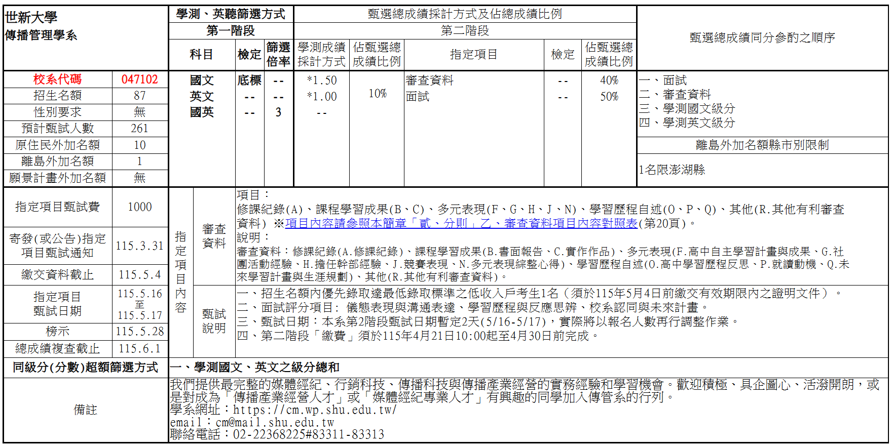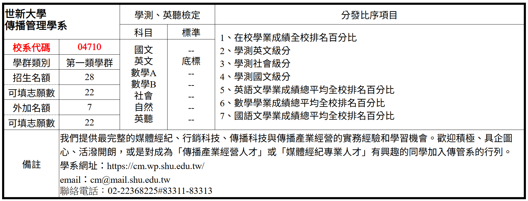 一、大學繁星推薦 ※傳播管理學系-大學繁星推薦錄取標準: 115學年度大學繁星推薦招生校系分則查詢(047世新大學) (去年參考資料)114大學繁星推薦入學招生各校系錄取標準一覽表 二、大學申請入學 ※傳播管理學系-大學申請入學錄取標準: 115學年度大學申請入學招生重要事項說明(047世新大學) 115學年度大學申請入學招生校系分則查詢(047世新大學) 114 學年度大學申請入學第二階段指定項目準備指引 (去年參考資料)114學年度申請入學各學系篩選標準一覽表 三、大學分發入學 ※傳播管理學系-大學分發入學錄取標準: 114學年度大學【分發入學】招生校系分則查詢網址(047世新大學) 四、外國學生申請 114學年度外國學生申請入學簡章 ———————————————————————————– 招生資訊相關連結