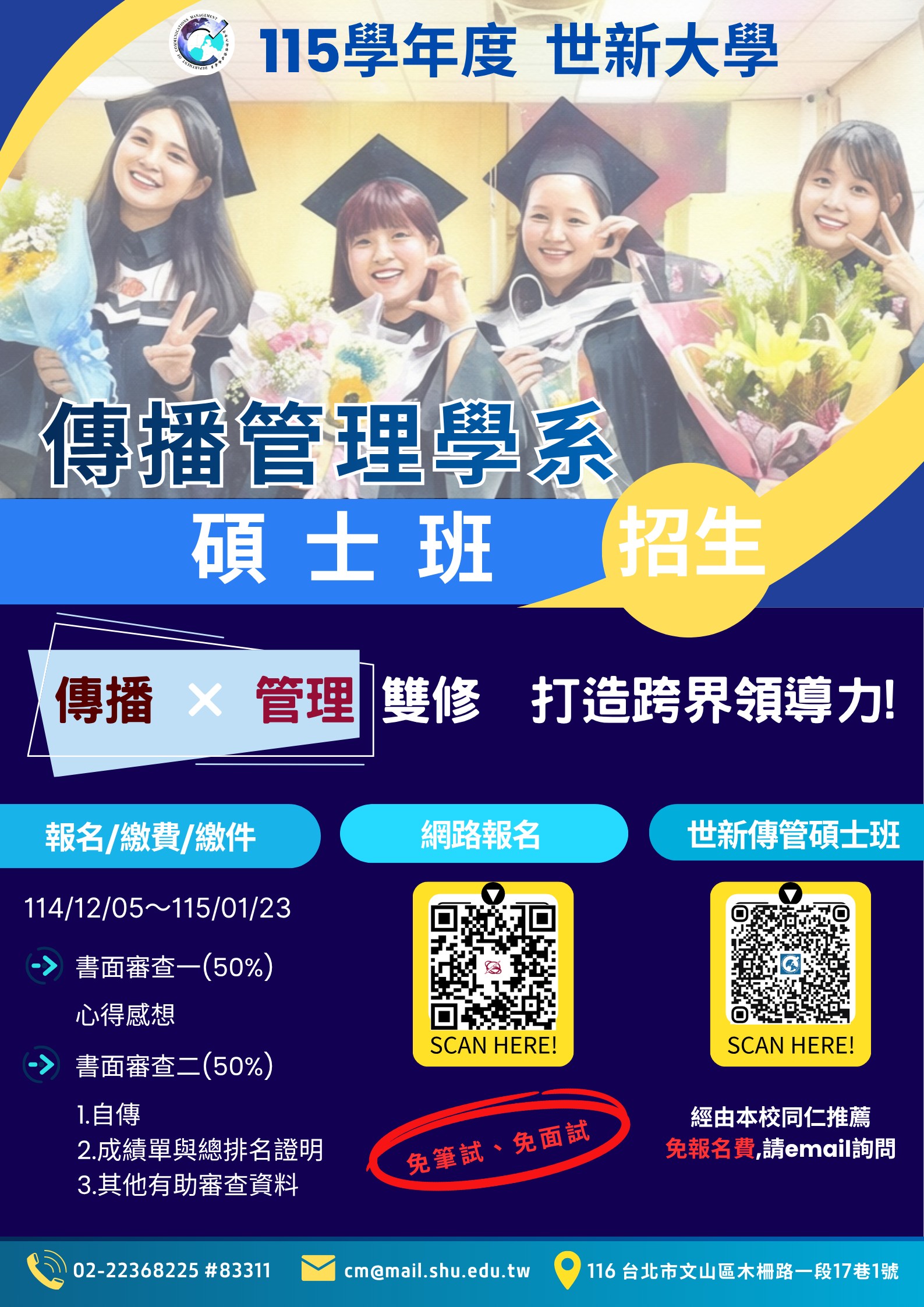 🎓【世新傳管碩士班|115學年度一般生招生開跑!】 發佈日期: 2025-12-01 作者: 傳播管理學系 你想學傳播?懂管理?玩創新?看懂數據? 來世新傳管,讓你成為未來的主角!🌟 💡 為什麼選世新傳管? ✨ 傳播 × 管理 × 創新 × 數據 ✨ 打造全方位跨域領導人才 ✨ 書審100% (免筆試、免面試)! ✨ 經本校教職員推薦免報名費! 📌 報名資訊 🗓 報名/繳費/繳件:114/12/05~115/01/23 📝 考試方式:書面審查(100%) 🎓 報考資格: 1.大學畢業(含應屆) 2.同等學力資格者 📂 備審資料: ✔觀察報告或心得感想 ✔ 自傳 ✔ 成績單與總排名證明 ✔ 其他有助審查資料 🔗 快速連結 🌐世新傳管碩士班:請點我 📘 招生簡章:請點我 🖊 報名網址:請點我 📞 聯絡我們:02-2236-8225 #83311 📧 Email:cm@mail.shu.edu.tw 📣 想升級職場力?想轉換跑道?想學AI、行銷、影視企劃? 👉 快來報名世新傳管碩士班,開啟你的未來新可能!
